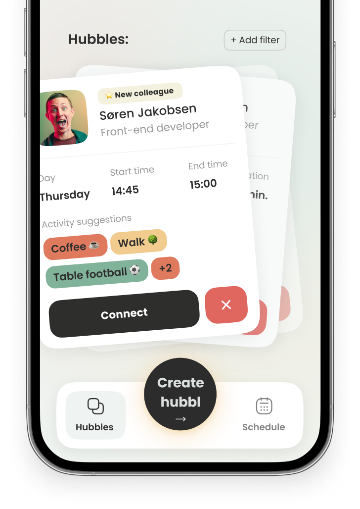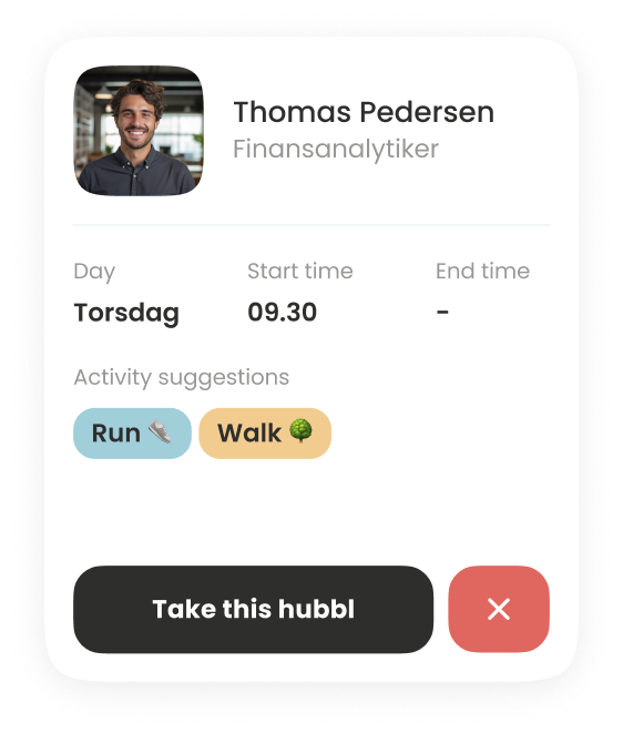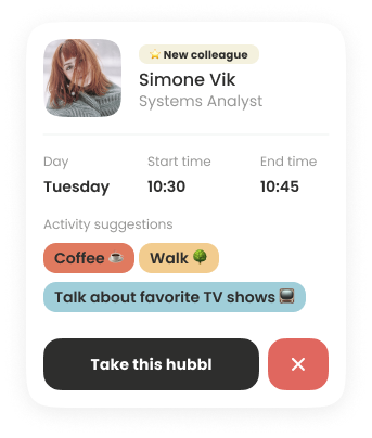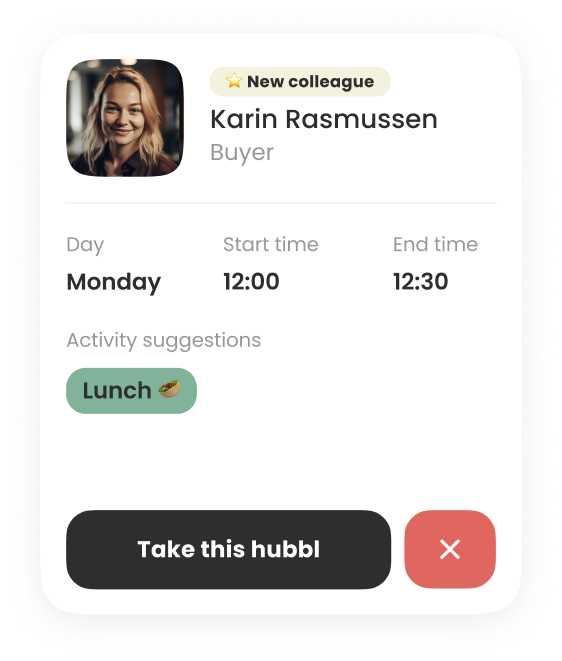"Hubbl is truly a huge life-saver and a game-changer for me and my area of responsibility. It makes it SO EASY to initiate social events, and not least that everyone in the office can simply launch initiatives themselves. And I should say hi from the newcomers and say that it has helped them greatly to quickly feel included in the community!"